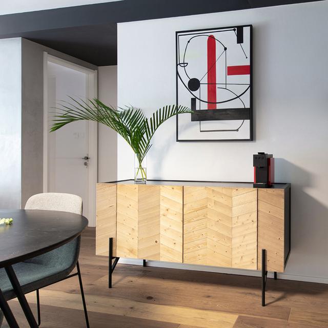 在餐厅旁边并没有打柜,而是摆放了一张成品餐边柜,餐边柜十分精致,表面还有精美的纹路,在柜子上还摆放一些绿植点缀,成为餐厅一道亮丽的风景线。在高级灰色的背景墙上还装饰了一幅大尺寸的壁画,简单的装饰能够让餐厅显得更加丰富多彩。