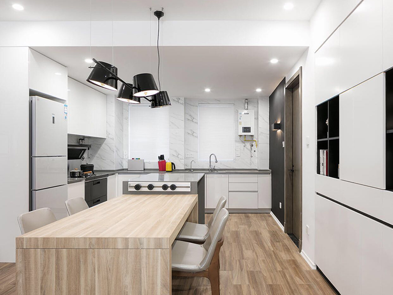 打造了一个开放式的厨房,以灰色和原木色为主,这样的搭配显得十分素雅时尚,同时也是现在比较流行的格调,橱柜与吊柜采用一体化的设计,采用入墙式的安装方式,白色的储物柜简约大气,同时也能提供相当好的储物能力,将厨房零散的物品更好的归纳起来,让厨房显得更加井然有序。