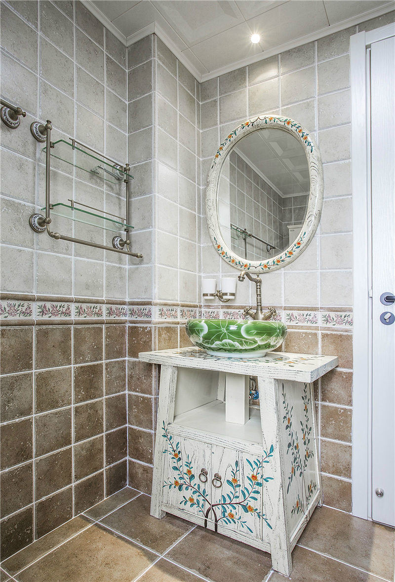 复古美式风格的家具和家居用品在材质及色调上都表现出粗犷、未经加工、或二次做旧的质感和年代感。用具多以舒适实用和多功能为主,不过分强调繁复的雕刻和细节,营造返璞归真的境界。在打造卫生间的时候,设计师更加注重舒适度与现代居室的时尚感,所以白色调搭配碎花的田园感觉布置,让人体验到现代居室的个性和时尚。