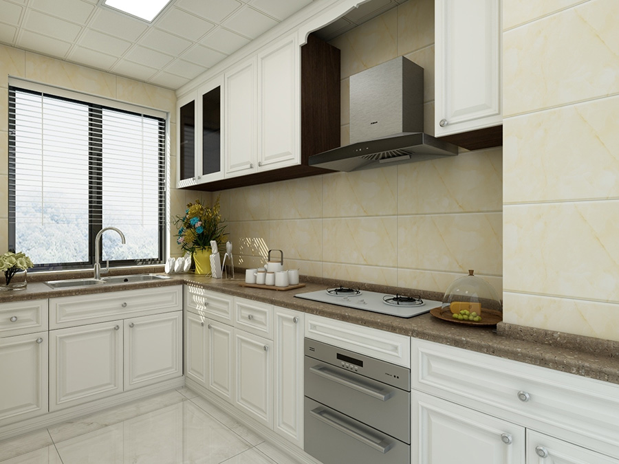 白色的橱柜,搭配褐色的大理石操作台,防划易清洁。上下柜体设计,为厨房的收纳提供了充足的空间。