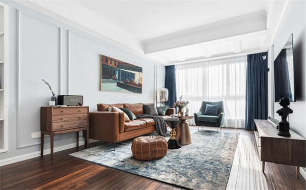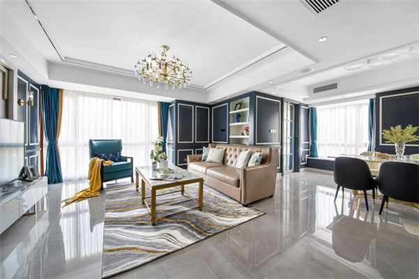 深蓝色窗帘选择,在简约大方的客厅空间中,格外显眼,与黄色的皮质沙发相互碰撞,成为客厅中比较亮眼的色彩,也是一种独特的美感。