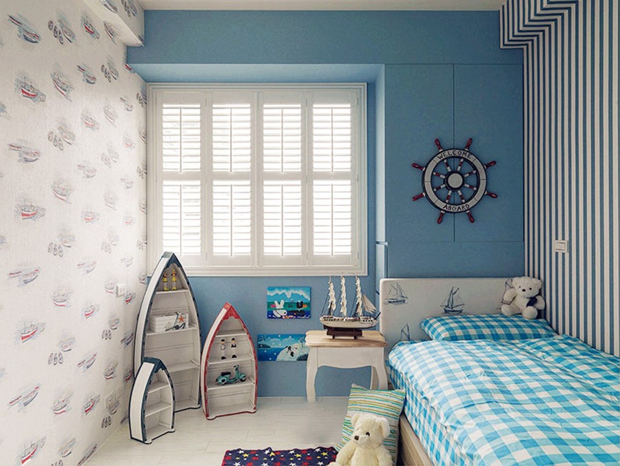 孩子的纯真需要家的保护,儿童房以蓝色为主,白色为辅,简单自然,更加符合小孩子单纯的个性。