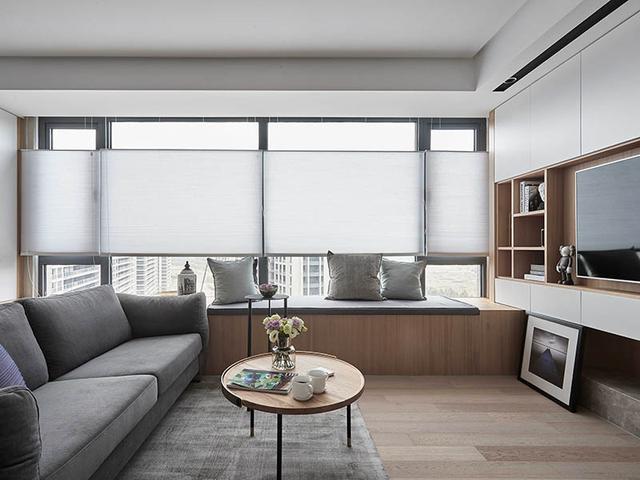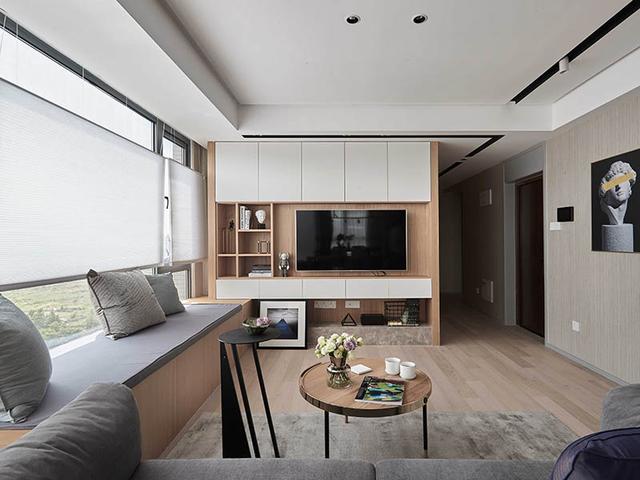 电视背景墙上采用打柜的方式,白色的电视柜与浅色的实木扣板非常好的搭配在了一起,在隔板上还能摆放一些书籍和艺术品,从而让客厅显得更加时尚有立体感,周围的柜子也能轻松收纳一些小件物品,让室内显得更加整齐大方,日常拿取物品也更加便利。