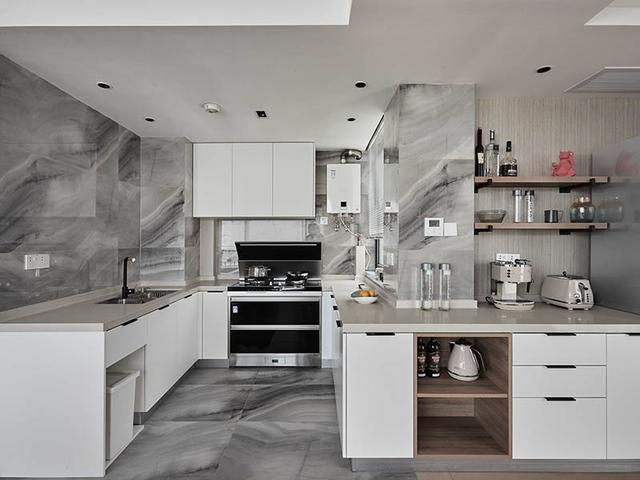 打造了一个开放式的厨房,这样能够让室内显得非常敞亮大气,厨房墙壁上采用了这种高级灰色的大理石瓷砖装饰,与白色的橱柜非常好的搭配在了一起,显得非常文艺有层次感。橱柜呈U型摆放安装,丰富的储物格设计能够将厨房的物品很好的收纳起来,让厨房显得更加整齐有序。