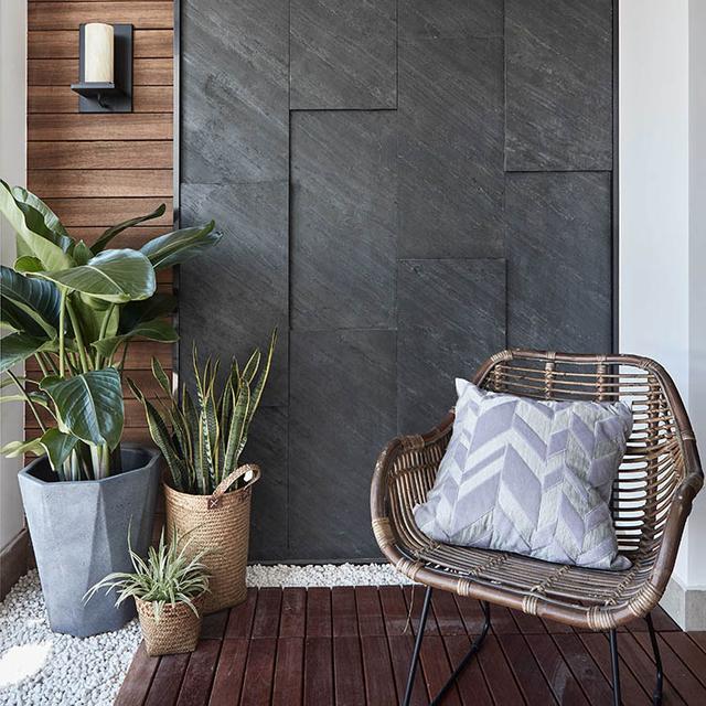 阳台与客厅之间采用开放式的设计,这样使得室内显得非常敞亮大气,能够让人感觉更加轻松。把阳台改造成一间休息区也是非常不错的,地面上采用实木的扣板,周围还撒了一些灰白色的石子,在靠墙角的位置还摆放了一些绿植,使得阳台显得非常时尚有质感,闲暇的时候可以在这里喝杯茶聊聊天,能够让人得到非常好的放松。