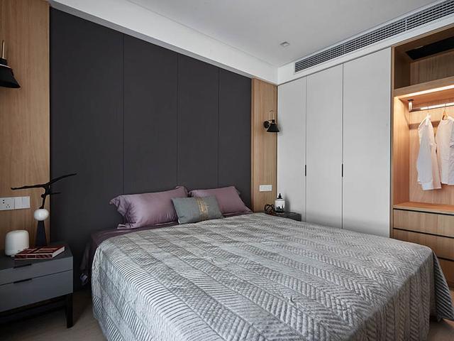 主卧床头背景墙上采用这种高级灰色的软包装饰,与两边浅色的实木扣板非常好的搭在了一起,显得非常时尚有层次感。卧室的衣柜采用入墙式的安装方式,还采用推拉门的设计,既不影响室内的美观度,同时也能将卧室的物品整齐的收纳起来。