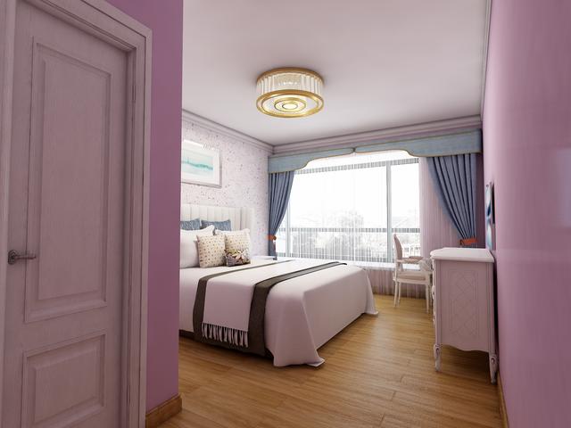 主卧在设计的时候以温馨浪漫为主,哥们在墙壁上大胆采用粉色的格调,搭配浅色的实木地板装饰,能够让卧室显得更加温馨浪漫。卧室的大床简单大方居中摆放,搭配舒适的被褥,能够营造出一种温馨舒适的休息环境,躺在大床上透过窗户也能看到外面美丽的景色,让人更加惬意舒适。
