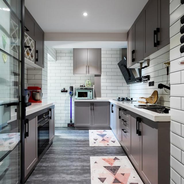 打造了一个开放式的厨房,厨房墙壁上采用了白色的瓷砖装饰,与高级灰色的橱柜和吊柜很好的搭配在了一起,能够让厨房显得更加时尚有层次感,同时也能起到很好的防潮效果,日常打理起来非常便利。橱柜和吊柜有着丰富的储物空间,能够将零散的厨具整齐的收纳起来,日常做饭拿取使用也更加便利。
