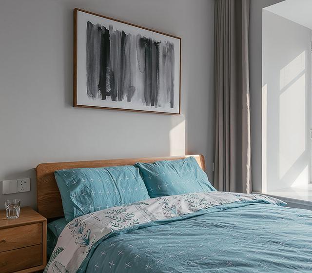 次卧的空间很小,和主卧差不多大,带有一个简易的飘窗,采光效果也十分的不错。为了让次卧看起来更敞亮素净一些,搭配的是原木色实木床和床头柜,黑白色艺术壁画挂在墙壁上,进行美化装饰也是充满了艺术气息,与灰色的墙壁进行衬托也是很具高级感。