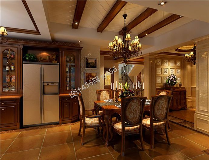 鹭湖宫365平别墅美式风格餐厅木质吊顶设计