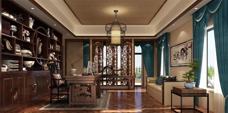 新中式书房布艺窗帘装修效果图片