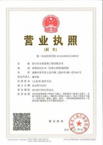 四川百合居装饰工程有限公司 一个靠诚信、品质、口碑快速成长的全新阵容 一个拥有四大部门、1000余职工、200精英设计师、280工队、八百优秀技工的规范团队 一个拥有近10000平米办公、展示的规模化企业…... 四川百合居装饰工程有限公司,与国内国外品牌材料厂家直线战略联盟,主要经营家装、别墅、酒店、K T V等项目。公司凭着勇于开拓、锐意进取的精神,本着用户至上、诚信为本的宗旨,全方位、高标准地发展壮大。发展至今。 公司倾力打造环保健康的居住空间;公司推出套餐、整装及打包一口价产品,为客户提供了多元化的选择; 公司秉承“不以见利为利,以衡为利”的经营理念打造成都性价比高的装饰公司;长期坚持“诚信为本,精细施工,客户至上”服务理念!! 施工队伍: 百合居装饰与其它公司相比较的特点是:施工队伍由公司直接培训、管理,而不是实行转包、分包。让客户体会到“你我共创,理想天地”!做到让客户满意。工程项目实行工长负责制,进行统一管理。 工程材料、质量标准: 所有工程材料,全部由公司统一配送,彻底杜绝伪劣材料流入工地,切实保障广大消费者的合法权益。(客户提问时:我们会提供一份材料表给您,您可以和我们的设计师商讨满意后需要您签字我们才会用。)验收也按照中华人民共和国《建筑装饰装修工程质量验收规范》验收。 设计师队伍、设计风格: 百合居装饰公司所有设计人员均具有本科以上学历,6年以上工作经验,专业水准在行业内颇具影响。设计风格多种多样:中式、欧式、现代简约、地中海、欧美风情等等,客户自由选择。 环保承诺和标准: 百合居装饰公司所有家居装饰工程均保证达到《民用建筑工程室内环境污染控制规范》中规定的相关室内空气质量标准。公司郑重承诺:对超标项目保证进行全额……