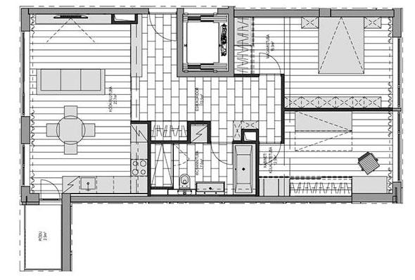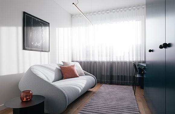 先来看看本案的户型图,标准的小两房户型,进门右手边利用定制储物柜进行空间隔断,增加室内的私密性。开放式厨房和餐厅位于客厅沙发的后面,家里唯一的阳台面很小,在厨房外。整个户型十分方正,空间的利用率很高。虽然是两房,只设置了一间卧室,另外一间卧室则设计成书房。无论是单身还是小两口,这样的小空间都有着非常不错的舒适性。