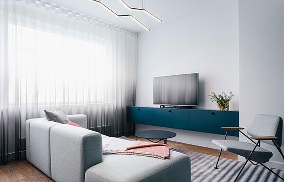 整体的设计效果十分简洁,墙面刷上白色乳胶漆,地面铺上棕色木地板,没有吊顶的客厅看起来却特别时尚上档次,这都得益于正确的色彩设计。白色的电视背景墙没有过多的装饰,定制的深蓝色电视柜采用挂墙式安装,底部留空的设计方式,不仅让打扫卫生更方便,也不会占据地面空间。