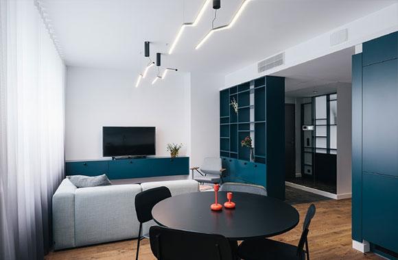 05-12小户型空间装修一定没档次吗?当然不是了,这主要还是看色彩设计与软装搭配是否恰当!60多平米的小两房,整体采用十分简洁的现代风格来设计,局部采用深蓝色来装饰,再搭配有点轻奢质感的家具,营造出的家居环境看起来特别漂亮。下面就一起来看看这套特别漂亮的小户型装修设计效果图!
