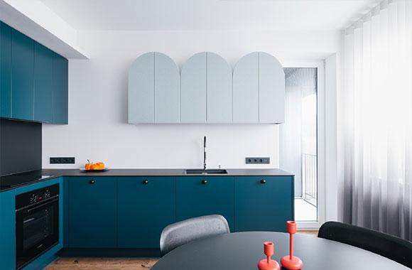 通往卫生间、卧室的过道,利用深蓝色板材定制的储物柜,既装饰了墙面,更提升了家中的收纳能力。储物柜和定制的橱柜连成一体,空间利用特别充分。