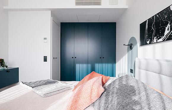 卧室的设计依然非常简洁,白色的墙面,棕色的地面,配上浅灰色布艺软包床架,极简的设计效果却很有高级感,用当下比较流行的词来形容就是有“逼格”!房门后就是定制的深蓝色衣柜,床尾墙面安装了深蓝色的挂墙式电视柜,与客厅的设计效果雷同。床头柜的造型设计非常漂亮,浅蓝色的挂墙式半圆形设计真是令人耳目一新。