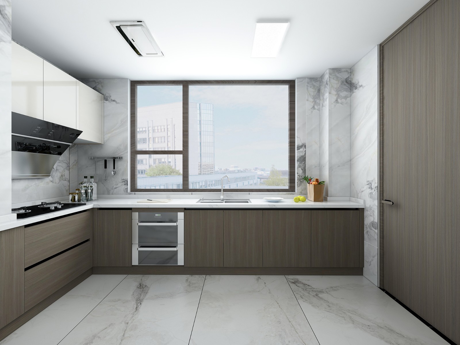 根据厨房空间,定制L型橱柜,吊柜与地柜结合设计,能充分利用空间的每1㎡。