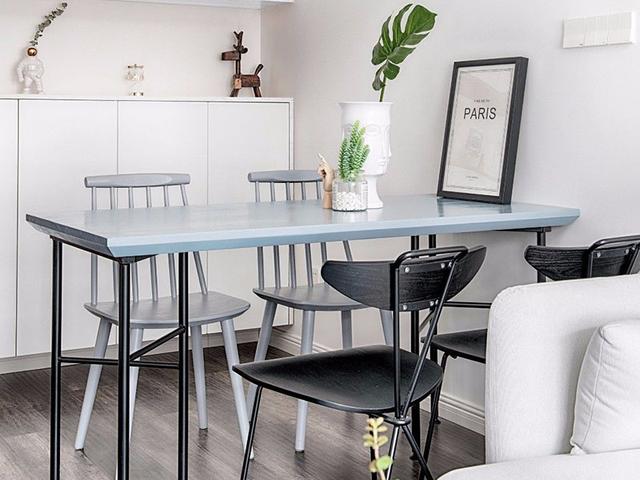 浅蓝色的餐桌非常精致宽敞,与周围灰白色的格调很好的搭配在了一起,从而给人一种十分清爽的感觉,搭配几把舒适的椅子,能够营造出一种温馨舒适的用餐环境,轻松容纳一家人吃饭用餐。白色的餐边柜很薄,采用壁挂的安装方式,既美观又能提供非常好的储物空间,将零散的餐具整齐的收纳起来。