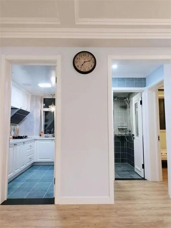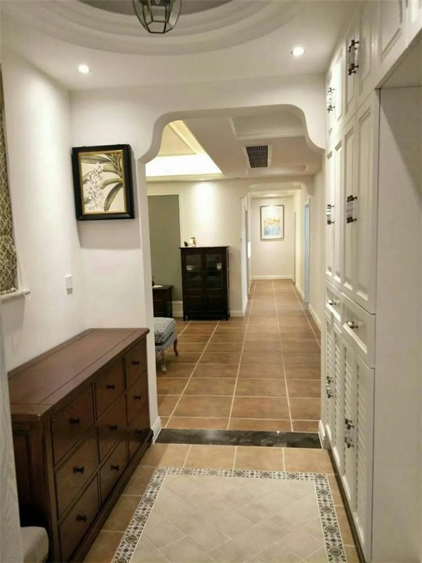 房门如果两边地面没有高度差,而且材质也是一样的话,也可以考虑运用彩色砖来做过渡,让空间显得更加活力跳跃,比如美式风格、田园风格中,就经常看到马赛克、彩色砖等比较显眼的门槛石设计。