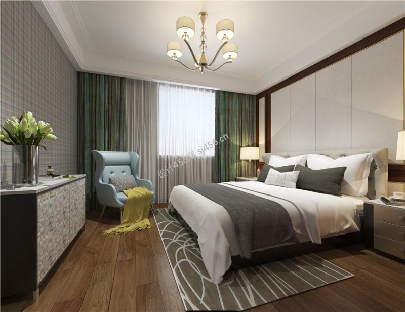 时代欣城三居100平现代简约风格卧室地毯铺设效果图