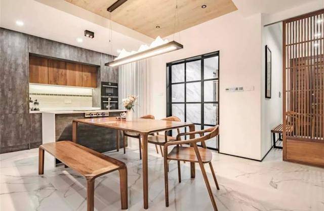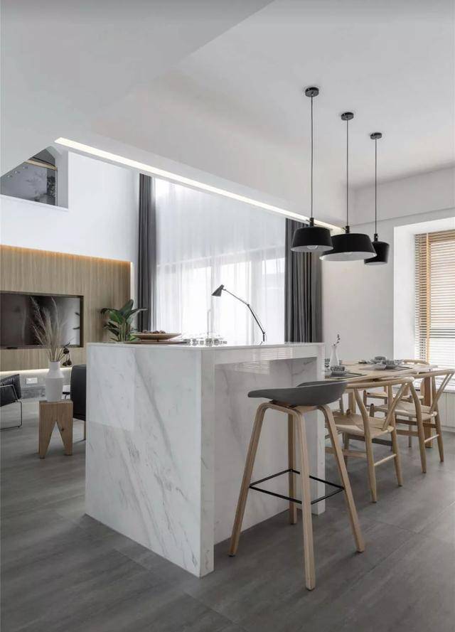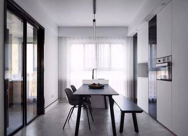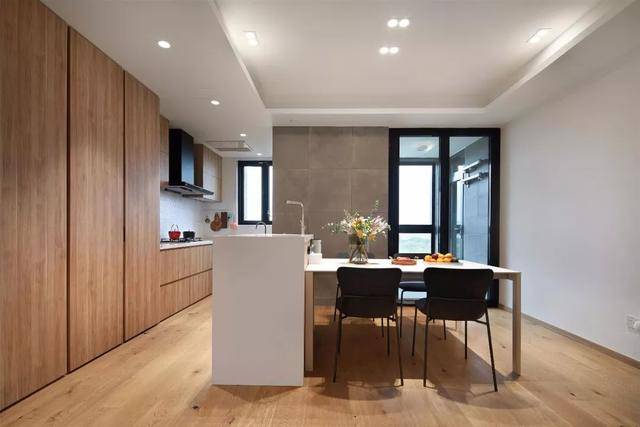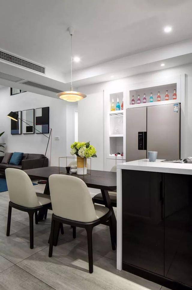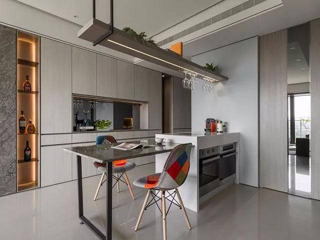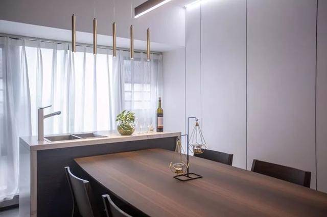 如果你想让餐厅更有整体感,可以选择将岛台和餐桌结合起来,就不用单独再去购买餐桌了。
