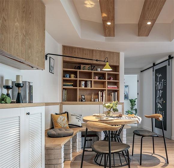 最喜欢的就是餐厅的装修效果,砖头加木板定制的卡座,配上圆形小餐桌和几把造型时尚的餐椅,极具生活情调的用餐氛围让人感觉特别幸福。半人高的鞋柜和卡座连成一体,墙面上更安装了吊柜和嵌入式的展示柜,空间利用合理还特别实用。