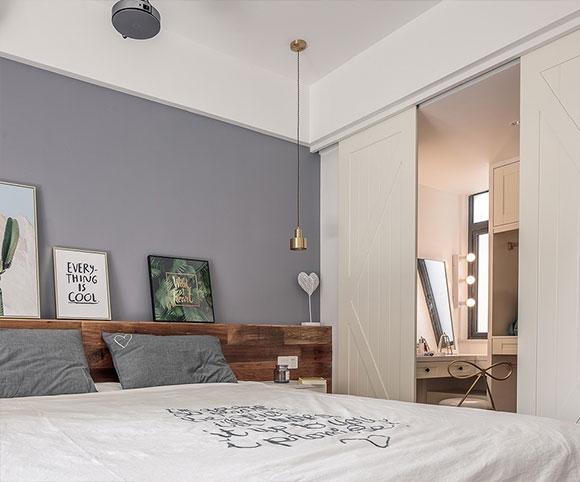 虽然卧室的面积不是很大,屋主却设置了一间独立的衣帽间,并利用白色的推拉门隔开,有点谷仓门的设计效果让家居生活变得更加惬意更加有情调。