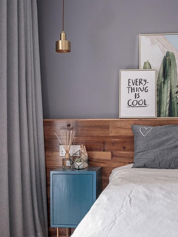 棕色木地板装饰的墙裙,配上深蓝色的方形床头柜和银色外罩的小吊灯,提升了卧室的装修档次和设计效果。许多朋友在装修卧室时,床头两侧的床头柜款式相同,对称式的设计或许效果会更为统一,但灵活性却有所欠缺。本案则采用了非对称式设计,一白一蓝,一大一小的组合,让卧室变得更有趣味性。