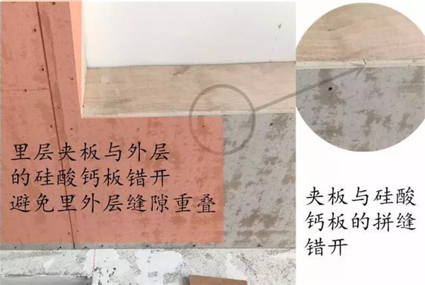 让里层的夹板与外层的硅酸钙板的拼板缝隙错开,避免两层的拼缝重叠,增加吊顶表面的稳定性,防止开裂。