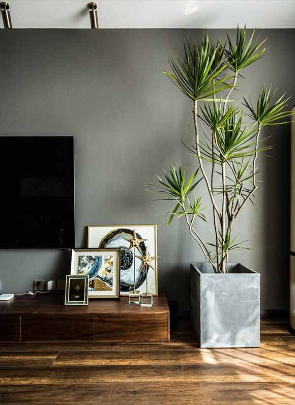 客厅的面积不是很大,没有阳台的客厅,大大的落地玻璃窗为空间提供充足的采光效果,虽然整体的色调较深,却也不会让人产生不适感。电视背景墙刷上灰色乳胶漆来装饰,地面放置了一张棕色的实木电视柜,旁边利用水泥制的花盆来点缀,提升了客厅整体的装修档次。