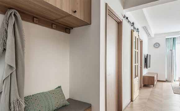 进门处的过道,利用墙面凹陷位置定制了吊柜和换鞋凳,吊柜下方安装了挂钩,用来挂放衣物、雨伞、包包等物品,提升家居生活的方便性。原木色的外观与白色的墙面搭配,看起来的效果简洁而大方。