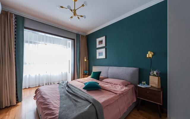 主卧的装修比较简约具有高级感,卧室与阳台一体式打通的设计,合理的进行阳台空间利用,打造成了一个可以储物的空间。墙壁喷漆是深绿色,搭配灰色复古的家具,打造出一个很具高级感的卧室环境。阳台靠墙打的是白色柜子,解决了卧室收纳的难题,让卧室也变得更为宽敞。
