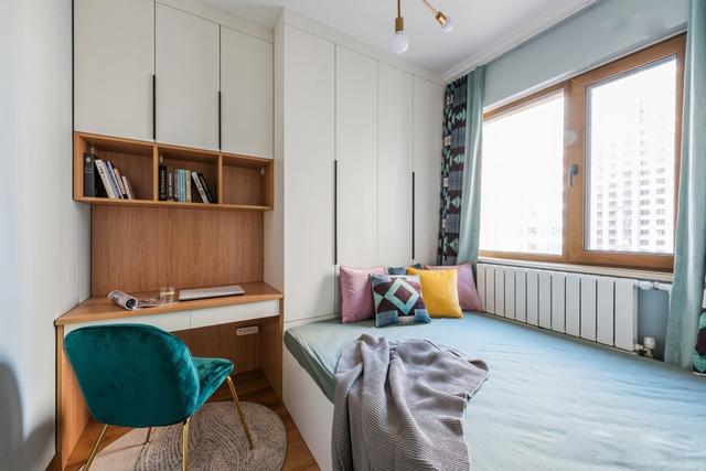 次卧的装修比较简约时尚,打造的是一个榻榻米的卧室,一体式结构设计的榻榻米,床铺衣柜以及学习桌椅,这样的一体式结构的设计,可以满足更方便的储物。次卧窗户也很大,显得次卧采光效果更好,这样的次卧可以用来当做儿童房,居住也会很舒适宽敞,不会有拥挤的感觉。