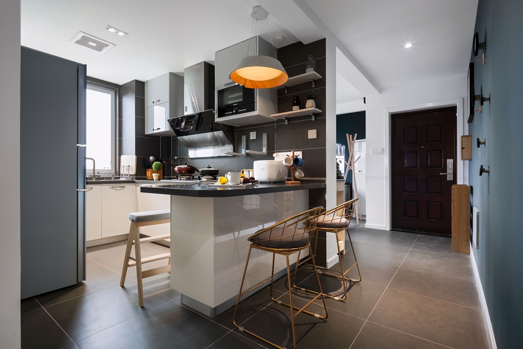 厨房是开放式设计,户型没有独立的餐厅位置,就在过道靠走廊处设吧台,可以容纳5人左右同时用餐,时尚又实用。