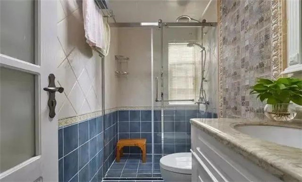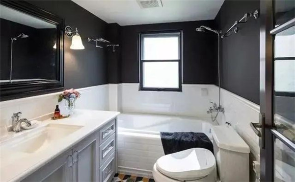 卫生间墙面上下分色给人一种强烈的视觉感应,上下分色是比较常规的铺贴法