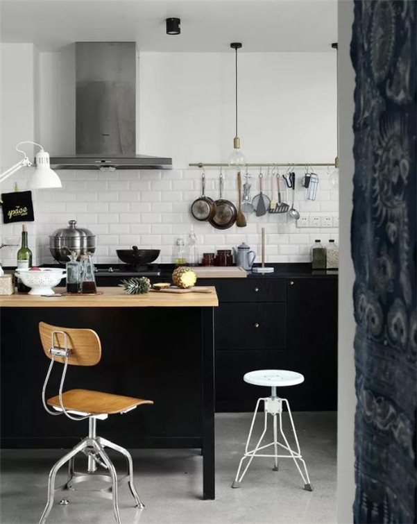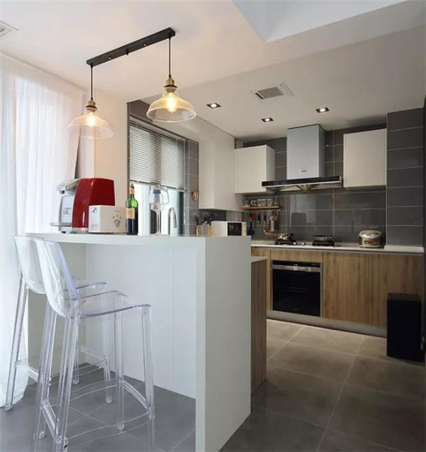 作为开放式厨房,无论是视觉上,还是功能上,都要跟外面的空间有个衔接,这个衔接,就可以是吧台,而且吧台的设计除了空间过渡外,还能充当半个餐厅使用,一个人在厨房做饭时,另外一个在吧台跟TA聊天,氛围很好。
