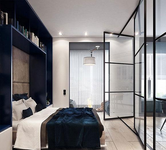 玻璃墙隔出的独立卧室空间,可以折叠的玻璃门显得特别有新意,玻璃的通透性也让隔断后的空间不会太过拥挤。或许有朋友会觉得改用推拉门的方式来设计更实用,毕竟折叠时需要占用一些空间。床头墙面顶部和两侧是定制的书柜,提升空间的利用率和实用性。