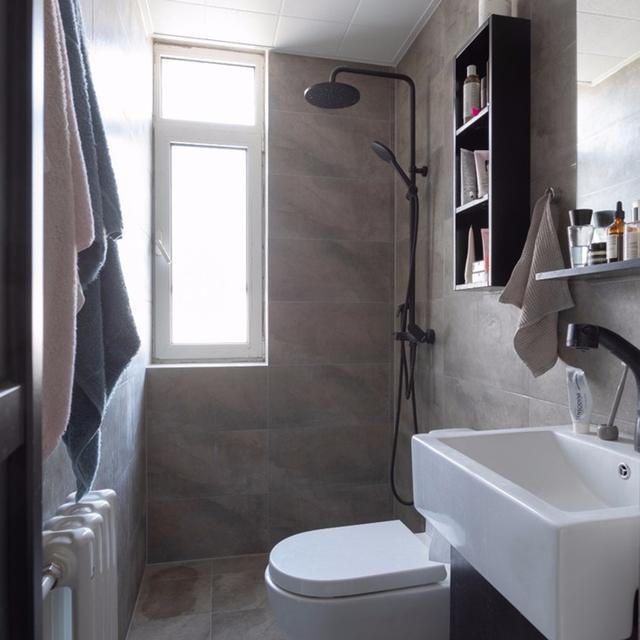 卫生间的装修没有做干湿分离,墙壁和地面铺的是灰色瓷砖,搭配的是小型的卫浴基础设施。黑色的浴柜和花洒,与白色的其他设施进行搭配,整个空间虽然面积不大,但是会却的格外富有简洁的敞亮感。以后在这样的空间洗漱沐浴,也会很舒适惬意,打扫起来也更方便。