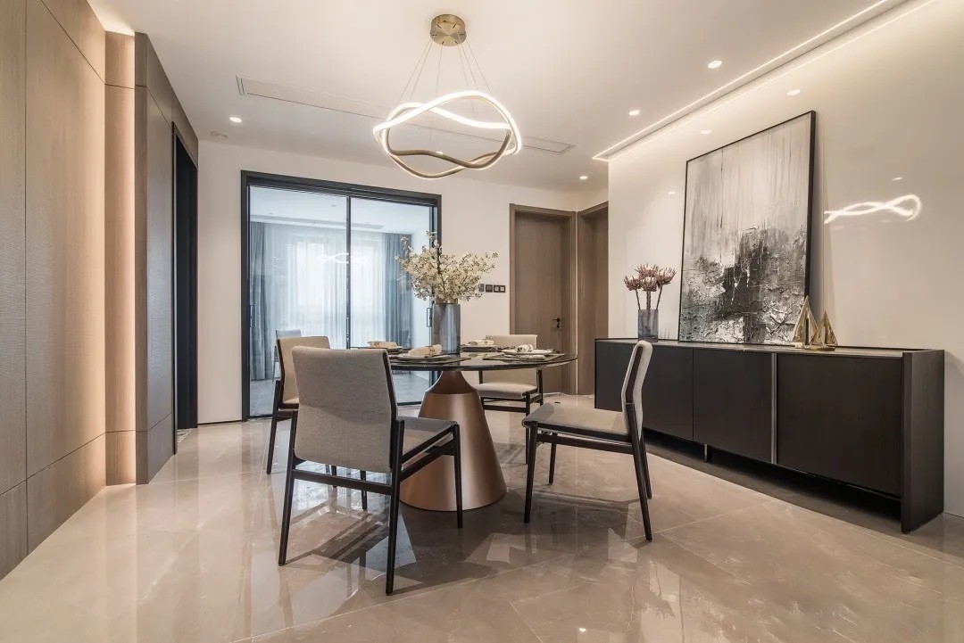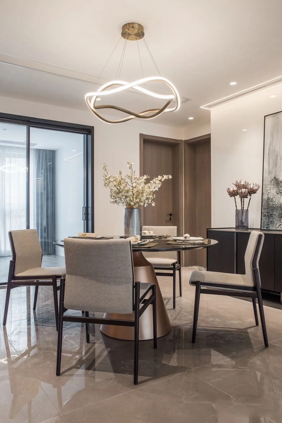 餐桌餐椅与空间整体色调一致,给人沉稳尊贵印象,杯盘温润,加以金属构件装饰,为视觉路径创造停留点。
