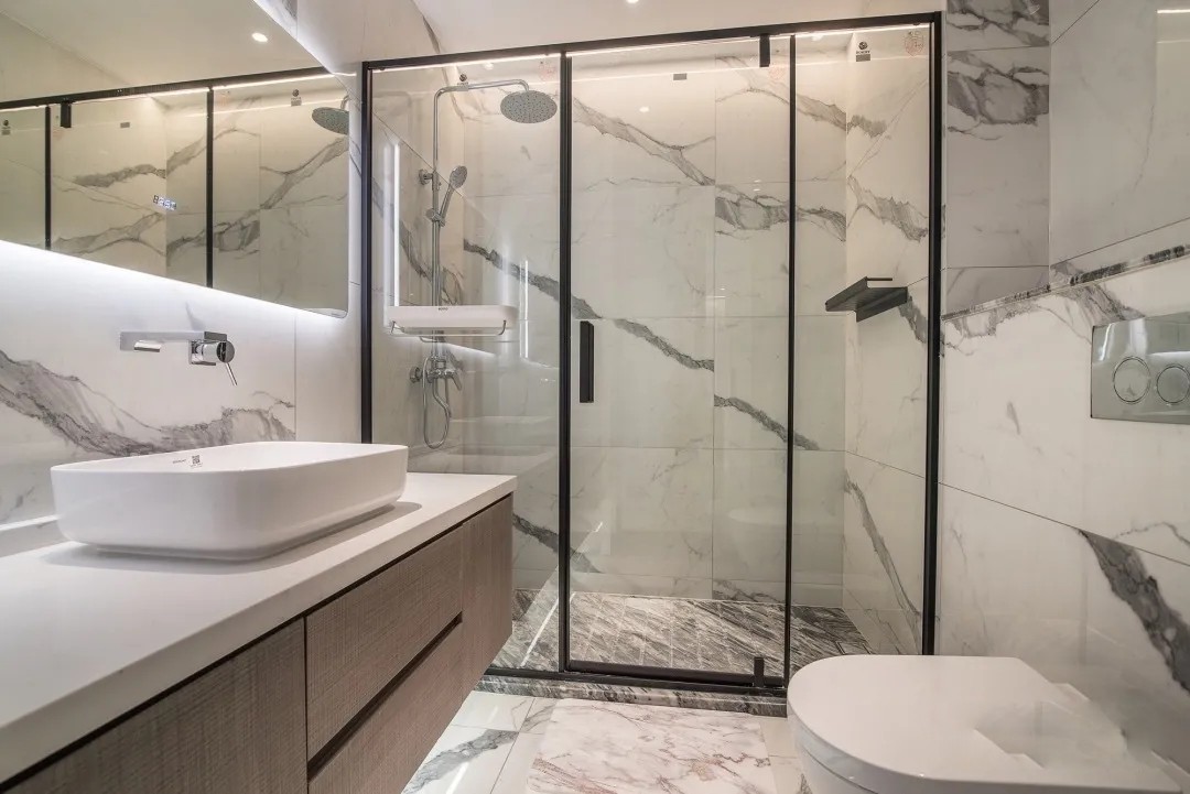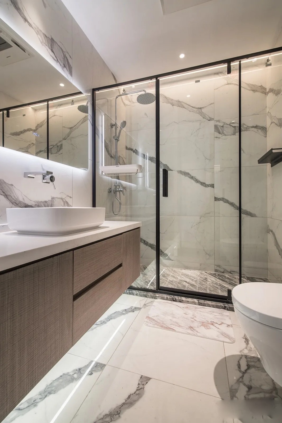 卫生间大气恢弘的爵士白大理石,碰撞出空间深邃静雅的氛围,在细节处彰显豪宅之尊贵。