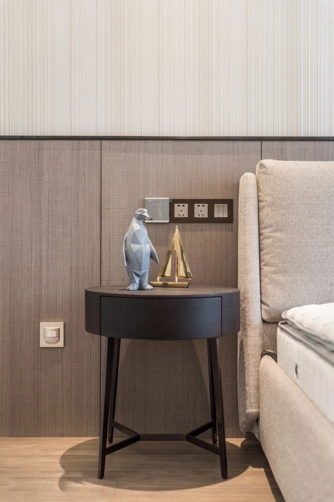 一个注重结构美,骨架美,建筑美的室内空间,色彩是我们需要谨慎考虑的。卧室采用中性色调,配合浅灰色布艺窗帘和实木地板等,创造一个有层次的空间,在繁忙间拥有纯粹的安宁。