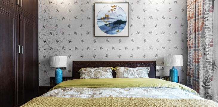 次卧则以姜黄色为主色调,碎花纹墙壁给人带来细腻,神秘的感觉,整个空间成为了古典设计浓郁的床头灯的秀场,木质床柜散发出来的气质,将存在这里的所有色彩都注入生命,给人以优雅温馨、自然脱俗的感受......