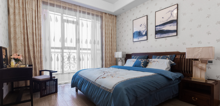 卧室作为私密空间,也是人心性的体现,主卧室则以不同层次的蓝色拼接主打主色调,在视觉上直接性的定位新中式的氛围。整体基调较为朴素,身处其中,每个细胞都放能松下来,逃离了喧嚣,感受到一缕安宁与惬意,享受着此时的舒适与温情。