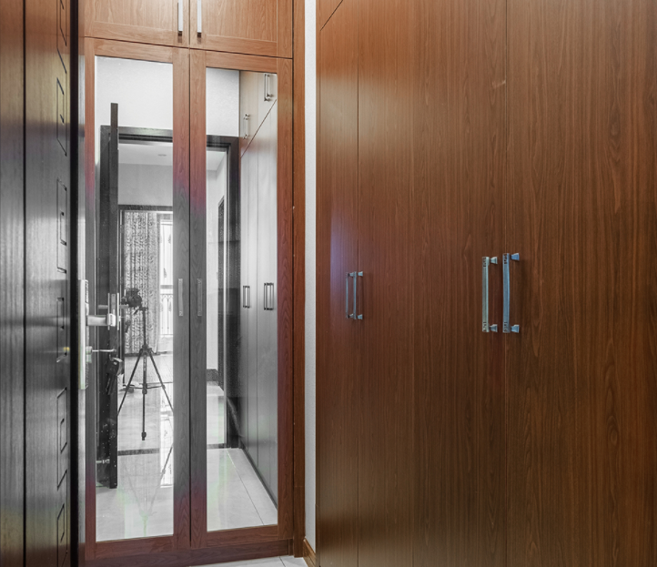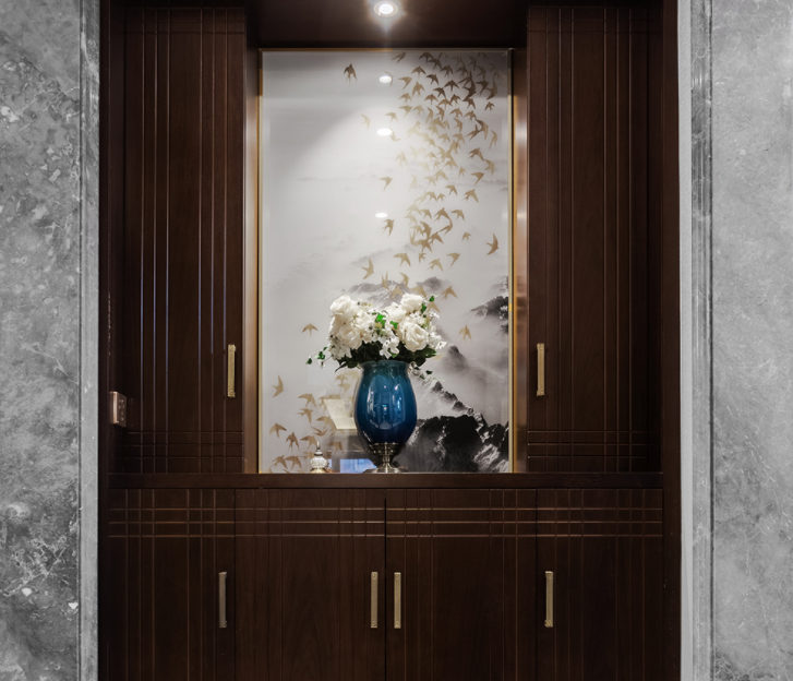 普通的过道也拿出了它踏实诚恳的态度,直线条的双开门立柜,不仅增添了家里的收纳空间,更给予这个过道新中式风格,最原始的热情,简单、实用且和谐。