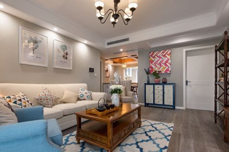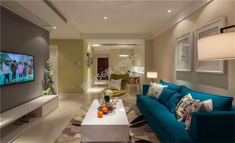 湖光山色现代风格三居客厅蓝色沙发装修效果图