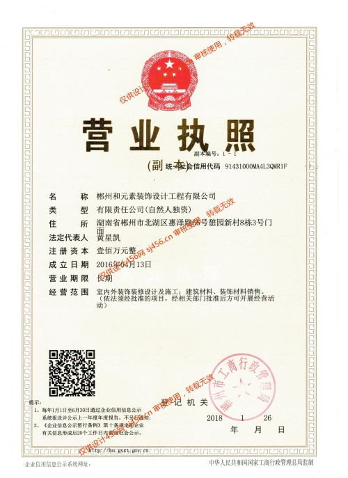 郴州和元素装饰设计工程有限公司成立于2016年04月-13日;是一家设计服务型、潮流领导型、工艺顶尖型的家装品牌公司,位于湖南省郴州市北湖区惠泽路66号憩园新村8栋3号门面; 和元素本着“客户至上,诚信为本”的原则,规范公司内部管理化,为营造公司更具竞争力的发展空间,同时也为创造更具人性化的公司企业文化; 公司将关爱每位员工的工作和生活,健康与快乐! 公司将尊重每位员工一点一滴的奋斗与付出! 公司有使命让每位员工充分施展自己的才华! 公司有使命让每位员工通过自己的努力获得更多的个人财富! 公司有使命让每位员工在公司这个优秀载体中,实现才干的不断增长,实现个人综合素质的不断提升。 和元素装饰将“对生活不要将就,让我们用爱成就一个家”确定为企业文化建设的核心理念,旨在建立一种,每位和元素人用“爱传递正能量”倾注到和元素这个大家庭;然后用微笑、尊重、热情、忠诚、智慧、专业,去妆扮每一位业主的“家”,千千万万个温馨的“家”汇聚在一起,构成我们的“大家”——中国。从各自小家、和元素大家、业主之家、直至中国之家,每个家都是心中挚爱,值得用一生去呵护,因此和元素有足够的理由宣称”祥和之家,和美设计,就选和元素” 一、5个一切 1、相信成就一切 2、学习改变一切 3、心态高于一切 4、选择决定一切 5、执行胜于一切; 二、企业精神 : 能者居上 诚信天下 优胜劣汰 合作共赢 三、22员工守则 : 1、遵纪守法;2、忠于职守;3、克己奉公;4、服从安排;5、尊敬领导;6关心下属;7、团结互助;8、同心协力;9、团队精、 10、爱护公物 11、勤俭节约;12、杜绝浪费;13、努力学习;14、提高水平;15、精通业务;16、积极进取;17、勇于开拓;18、持之以恒;19、完成目标;20、全力以赴21、接受挑战;22、立即执行 四、企业的宗旨:让全世界的家庭更健康; 五、企业的价值观:温暖、和谐、忠诚、正直、踏实; 六、企业的设计理念:用艺术点缀生活、用工艺造就完美、用真诚体现服务; 七、企业的服务承若:你安心,我放心 八、我们的愿望是:成为一流的装修公司品牌形象、做全国的家装设计培训公司; 董事长致辞 亲爱的朋友: 感谢您的支持和信赖郴州和元素装饰设计工程有限公司,在这期间,与和元素一起走过了披荆斩棘的风雨历程,留下了继往开来的辉煌足迹; 公司以“让全世界的家庭更健康”为企业宗旨,致力于品牌建设;和元素公司继续秉承“用艺术点缀生活、有工艺造就完美、用真诚体现服务”的设计经营理念,对每一个项目及每一位业主均会倾注独特的专业设计,并用创意性和实用性,让每一项项目及每一位业主享受到经济、实用、美观的效果以及温暖的家; 让更多的朋友加入我们、让我们共同向和元素的核心理念迈进“对生活不要将就,让我们共同用爱成就一个家”,和元素装饰设计工程有限公司竭诚欢迎广大客户前来洽谈合作!
