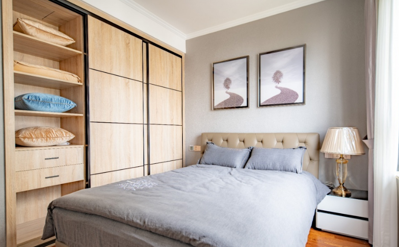 其次就是嵌入式的衣柜,就是利用了墙内的部分空间,让卧室的空间得以扩展一些,衣柜的深度和收纳空间也更多。