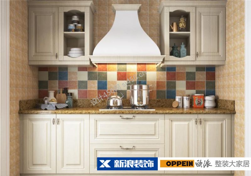 美式田园风格100平米三居厨房彩色瓷砖装修效果图