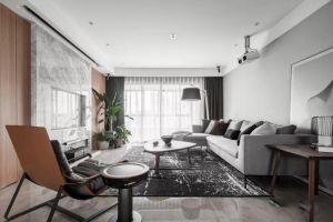 现代感的客厅里,黑、白、灰的色彩与大理石、金属、皮质等不同材质的组合,让空间呈现出一种高级的品质感。【达州巨头装饰】莲湖广场110㎡北欧混搭新中式装修案例